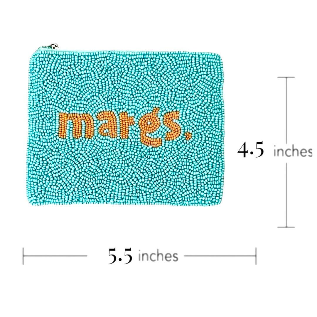 Turquoise beaded pouch with 'mares.' text and measurements on a white background