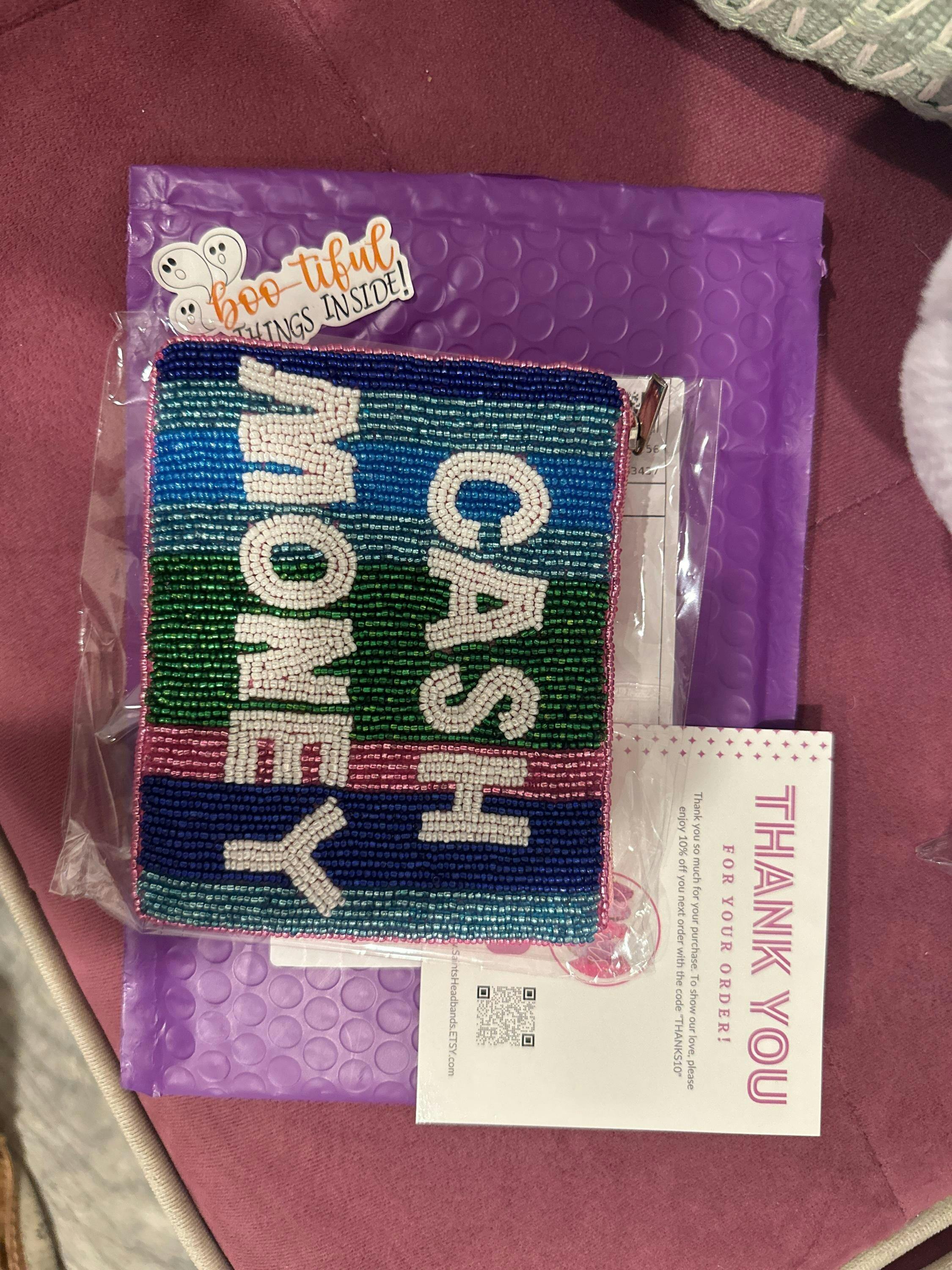 Hand-beaded coin purse with “Cash Money” lettering in white beads on a bold multicolored base, canvas backing, and secure zipper closure, a fun everyday essential.