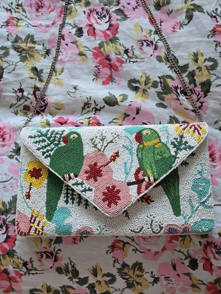 Bring a touch of paradise to your look with the Tropical Bird Floral Beaded Clutch. Handcrafted with acrylic seed beads in a vibrant tropical bird motif, this clutch is the perfect accessory for vacation or summer nights. Lightweight with a detachable silver chain, it’s equal parts chic and convenient.