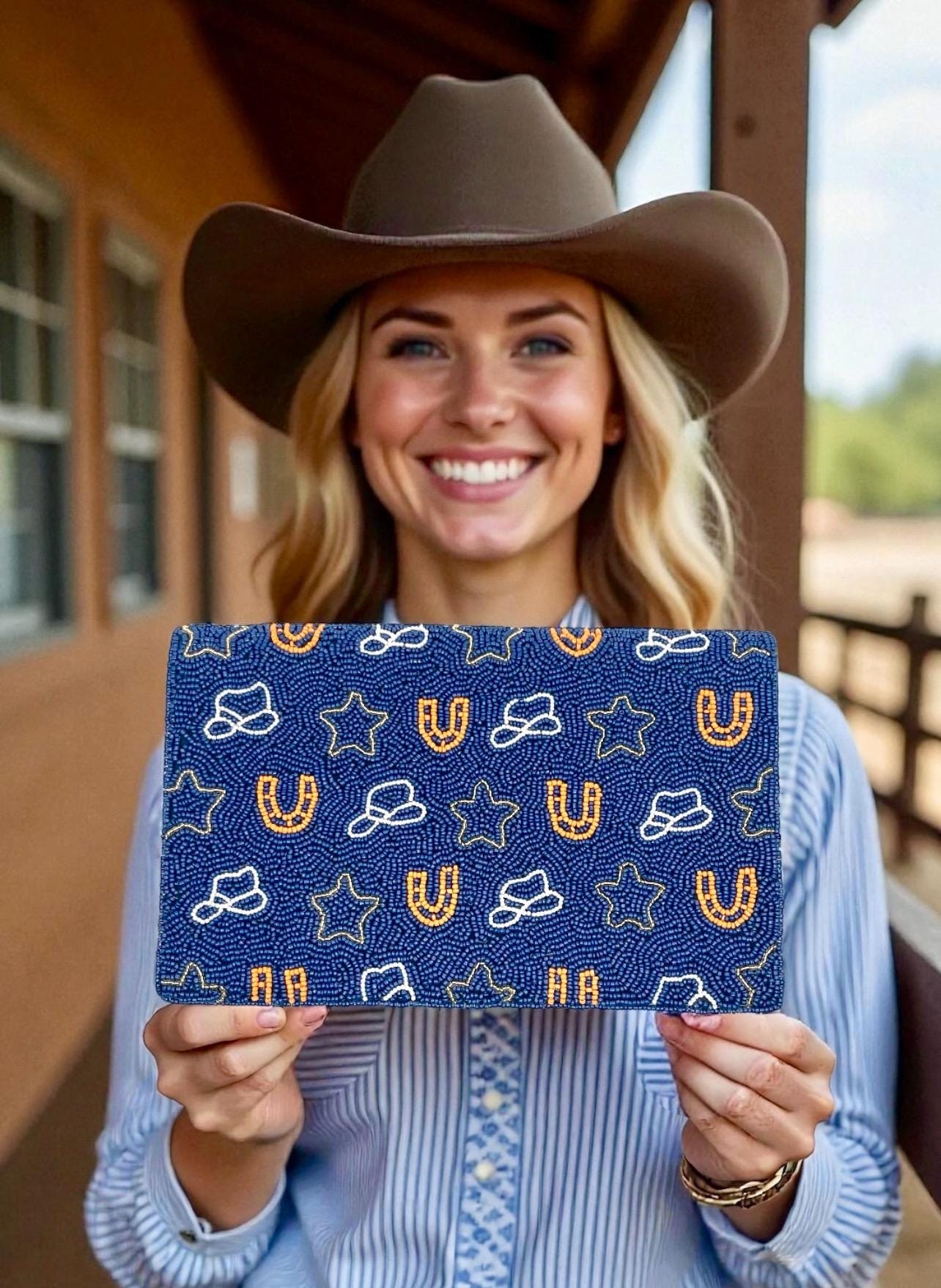 Bring fun western glam to your outfit with the Western Stars Horseshoe Beaded Clutch, exclusively designed by Saints Headbands. This navy beaded clutch features an allover pattern of gold horseshoes, white cowboy hats, and stars, perfect for concerts, rodeo nights, or game day. Carry it as a handheld clutch or attach the gold chain strap for a chic crossbody look.