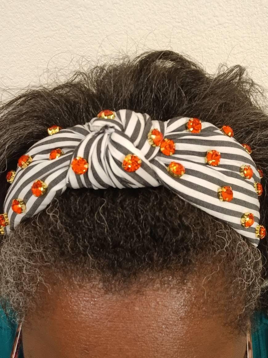 Halloween-themed headband with ghosts, pumpkins, and bats on a light pink background.
