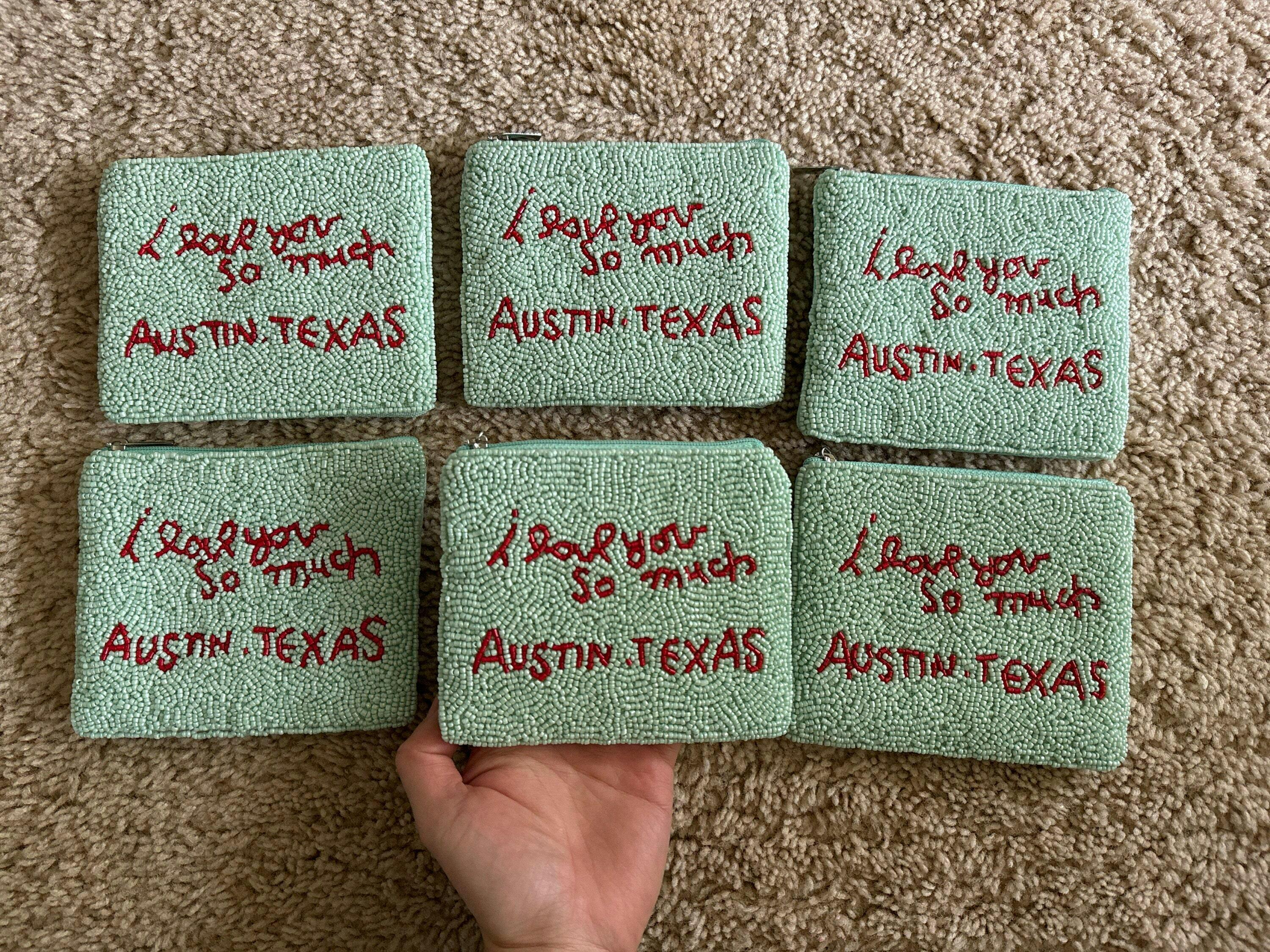 Hand-beaded coin purse with “I Love You So Much Austin, Texas” lettering in red beads on an aqau base, canvas backing, and secure zipper closure, Designed by Saints Headbands and inspired by Austin street art.
